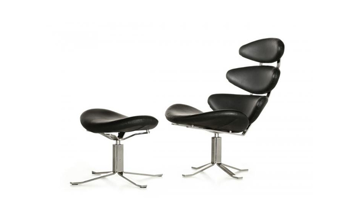 Poul M. Volther 于1964年的设计的王冠躺椅家具系列,是Poul M. Volther最知名的现代家具设计作品,此系列包括Corona Lounger Chair(王冠躺椅)、Corona Lounger Ottoman (王冠休闲脚踏)及其组合Corona Lounger Chair and Ottoman(王冠躺椅&脚踏)。历经40余年的今天,其作品在纷繁现代家具设计中仍占有一席之地。椅子充满了雕塑感,斯堪德维亚风格的简洁外形和舒适的坐感都是这张椅子成为创世之作的原因,四个椭圆形组成一张独特的椅子,无论摆放在哪,都令人过目不忘。此系列家具采用高强度钢材制作,表面电镀处理,外面为真皮或布艺制作,可360度旋转,不可后仰。适用范围广,酒店、会所、高档餐厅、夜总会、别墅等。