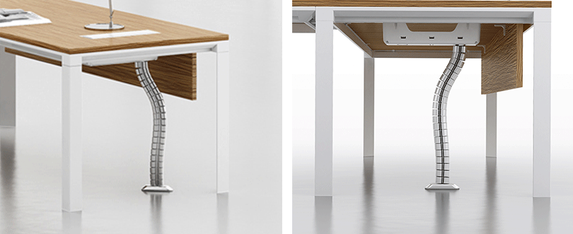 | 1、钢制脚架,实用高端大气; | 2、整齐划一、人性方便的桌面铝合金过线系统。 |