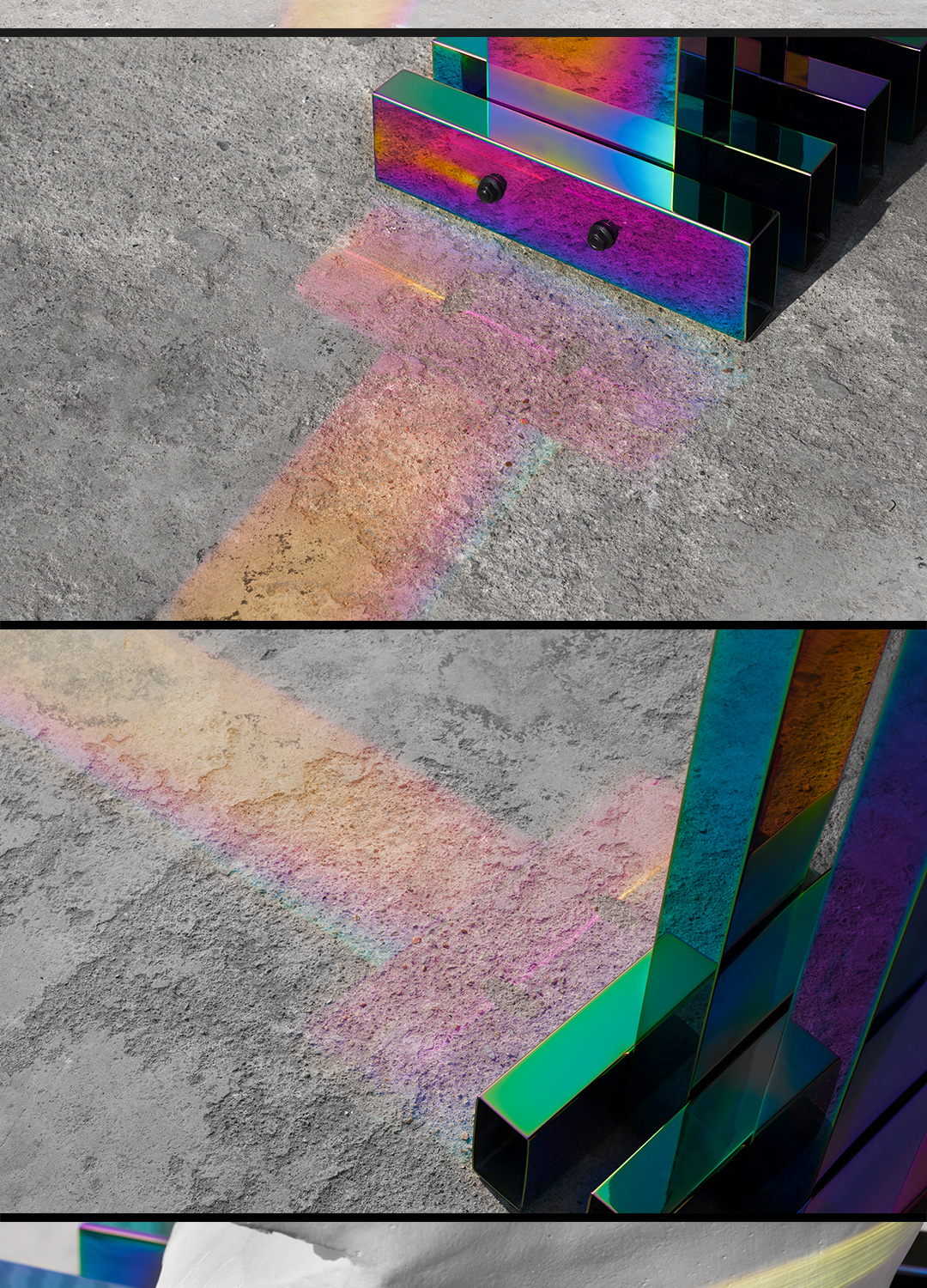 成熟常态的工艺完成规律性标准的矩形折面,与不可确定变幻成色的电镀技术,理性与非理性交集的不可控结果——不造,非常态。