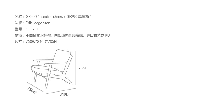 GE290系列座椅由丹麦设计大师Hans Jørgensen Wegner所设计。身为丹麦四大巨匠的Hans Wegner,是丹麦最知名、影响力最大的设计师之一,「全世界最美丽的椅子」正是出自他手,他的作品不仅常被冠上「不朽」、「永恒」等美誉,更是世界各地设计博物馆必备馆藏之一,而「椅子的大师」、「20 世纪最伟大的家具设计师」则是最常加诸在他身上的光环。GE290系列座椅拥有着自然、田园风格而且很容易搭配现代风格居室的家居用品,宽大平板扶手是特点,沙发坐垫柔软而且厚重,色彩丰富,可以用于休闲、休息时的躺椅,沙发的实木框架处理的光滑,触感舒适,从1960年到现在,GE290系列座椅已经历经了半个多世纪,也成了艺术博物馆收藏品之一,为后来的设计师提供了参考和借鉴,给家具行业添上了一个完美的音符。