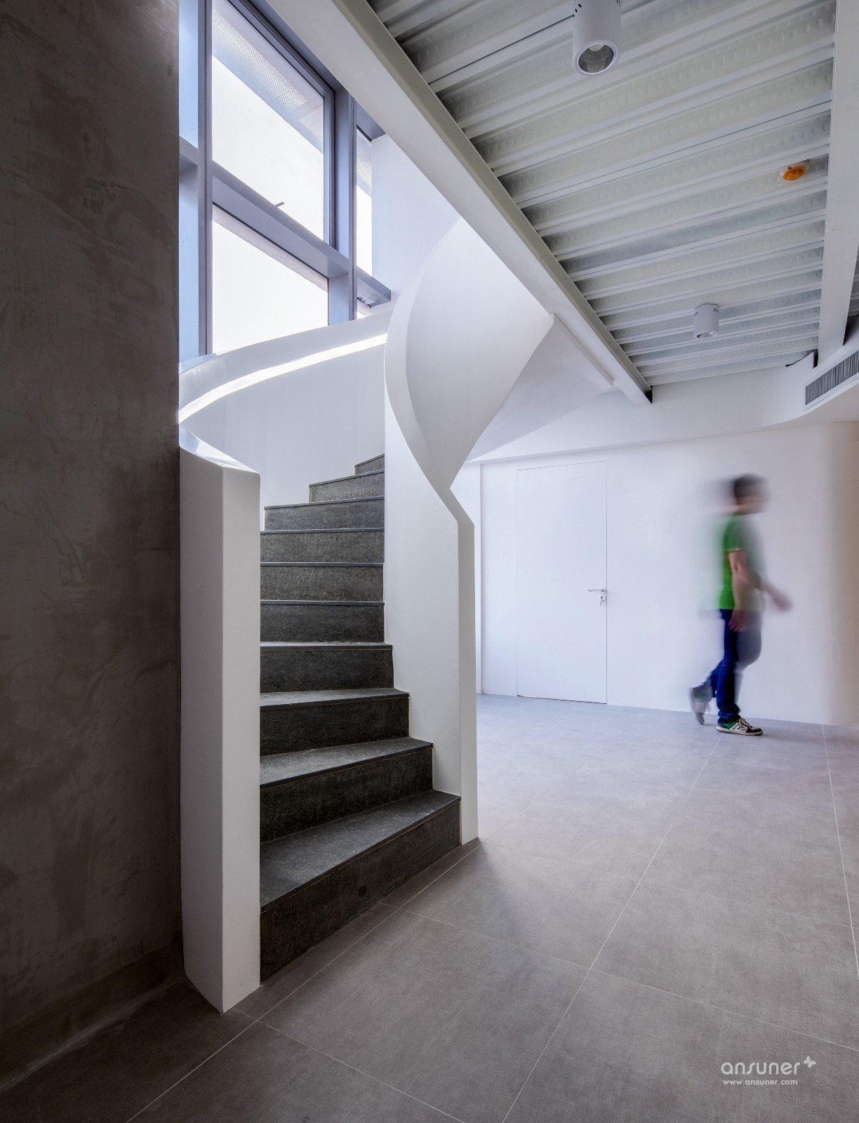 步入公司大门整个前台区以一种不规则的形态呈现在你的眼前,远角处经由一个廊口连接一层办公区域,设计师的故意为之让办公区不但具备很好的私密性,同时也保证了整个办公区不受外界干扰。沿着墙面蜿蜒的线条走进去,瞬间感觉豁然开朗,访客则会产生“别有洞天”的感受。楼梯间与公司唯一的8人员工区一起被放置在靠近窗户一侧,设计师还刻意保留了隔层的原始结构,以拉升空间高度,使公共办公区域得到有效增容,这样一来无论是在办公室里面还是员工区,都能轻松一览窗外美景。另外设计保留所有主体立柱以清水混凝土的外表体现,一丝工业风也油然而生。